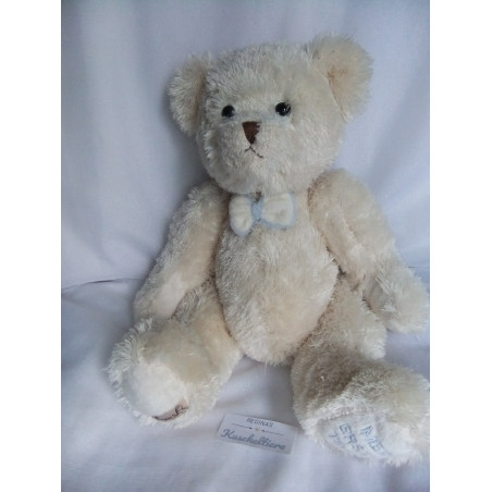 Bärchen hat sehr weiches Plüschfell. Die Knopfäuglein sind aus Kunststoff. Unter einem Fuß ist ein gestickter Schriftzug 'Mein erster Teddy'. Sieht mit seiner weiß/hellblauen Schleife/Fliege allerliebst aus.