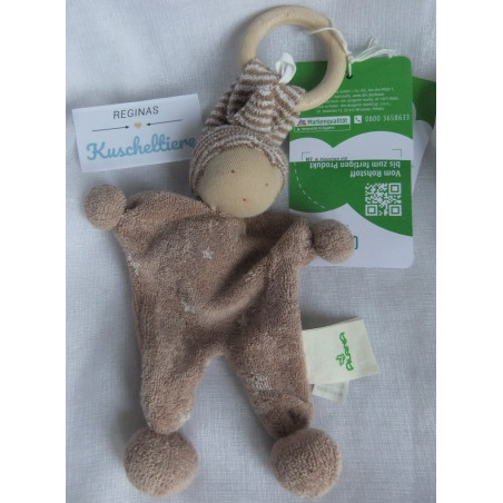 Artikel: Alana Schmusetuch Wichtel braun mit Sternchenmotiven, Zipfelmütze braun-beige gestreift und Holzring