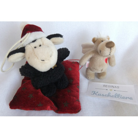 1 x Nici Plüschtier Schaf Lothar schwarz mit Weihnachtsmütze rot, weiß und auf Kissen rot mit Sternchen - ca. 9 cm hoch und ca. 9 cm breit - mit Herstellerfähnchen