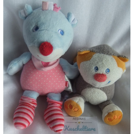 Beide haben aufgestickt Äuglein. Weicher Materialmix (Plüsch und Stoff) zum Tasten.